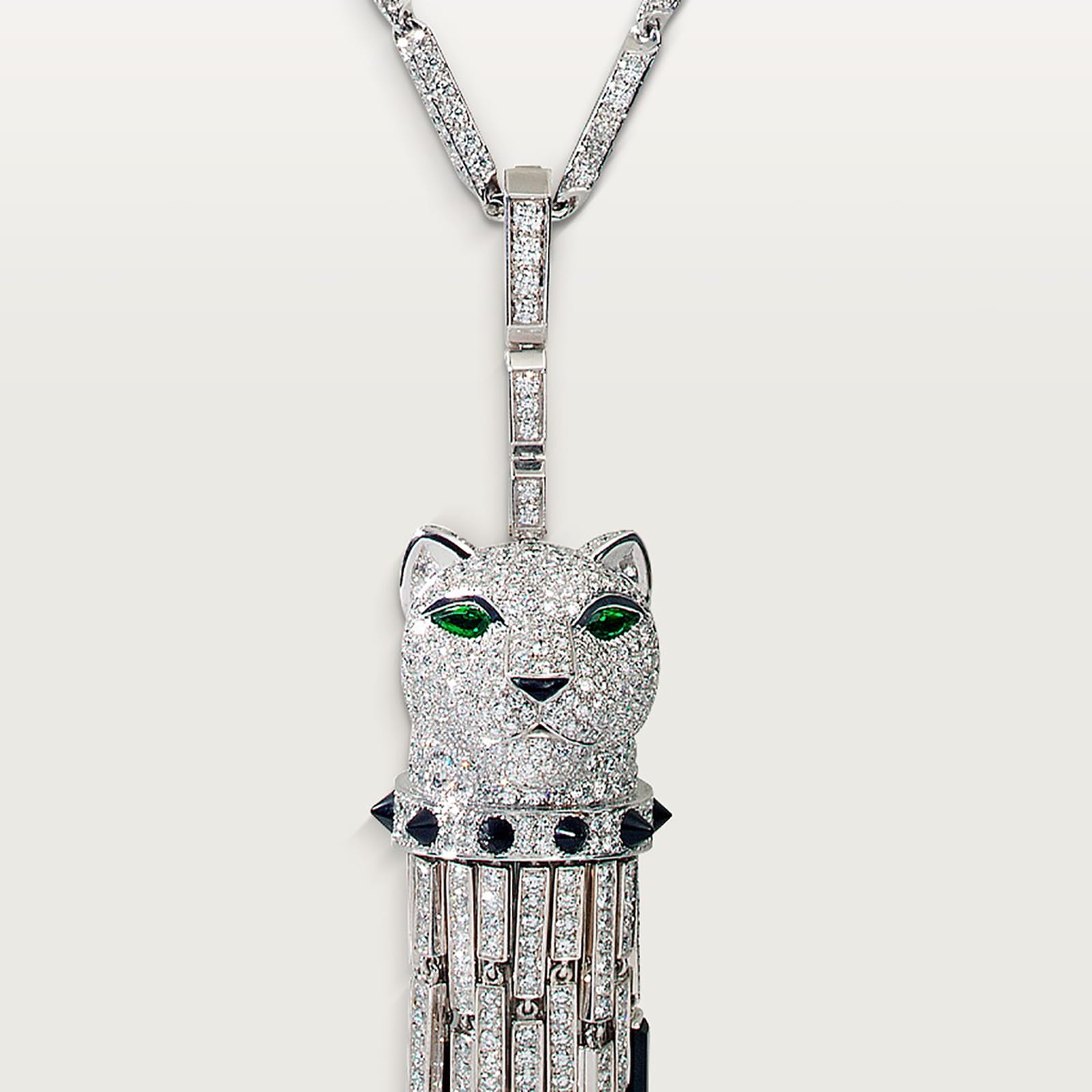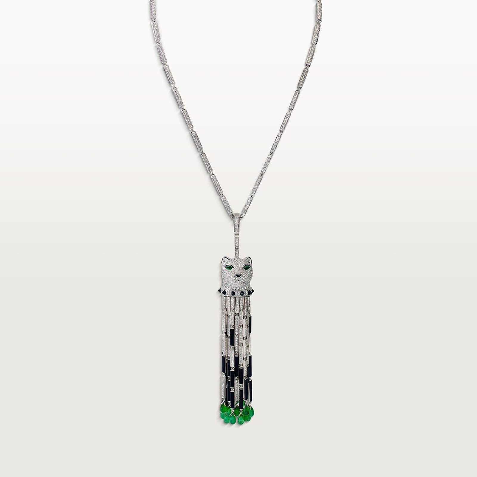 Panthere de Cartier necklace, white gold 750/1000, set with 19 emeralds, 1 onyx nose, 51 onyx stones, and 1,255 brilliant-cut diamonds totalling 17.43 carats.